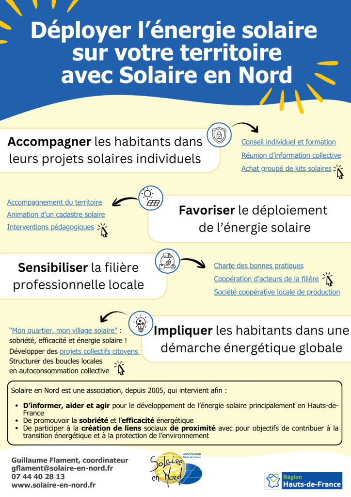 Solaire en Nord, association loi 1901 à but non lucratif créée en 2005, œuvre au quotidien pour la promotion de l’énergie solaire et l’implication citoyenne dans la transition énergétique en Hauts-de-France. Elle mène de nombreuses actions conformément à ses statuts :