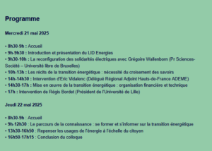 Pendant un an, les groupes de travail du LID Energies se sont réunis, selon un format inspiré des recherches participatives avec l’accompagnement de la Boutique des Sciences, afin de faire émerger des propositions favorisant la transition énergétique dans les Hauts-de- France. Le produit de ces réflexions est présenté lors de ce colloque interdisciplinaire qui s’adresse à l’ensemble des acteurs de la transition énergétique : collectivités territoriales, acteurs économiques, associations, chercheurs et citoyens.