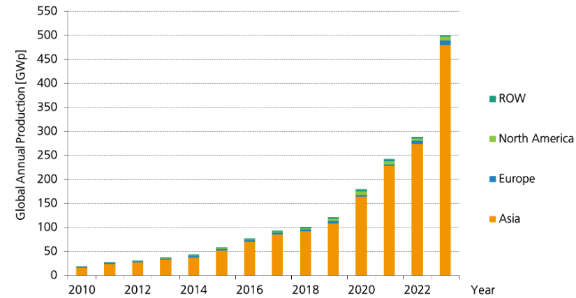 Le graphique ci-dessous décrit l’origine des lieux de production des modules photovoltaïques entre 1990 et 2023 en pourcentage.