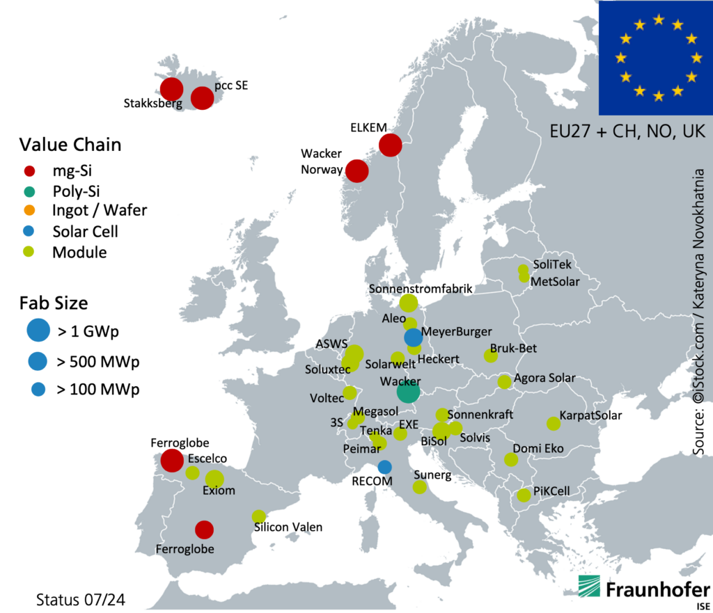 Environ 86% de la production mondiale de panneaux photovoltaïque est porté par le marché chinois. Certaines usines d’assemblage existent encore en France, et la dernière usine productrice de cellules en France va cesser son activité en 2025. Deux projets de constructions d’usines pour réaliser des cellules sont bien avancés : Holosolis et CARBON.