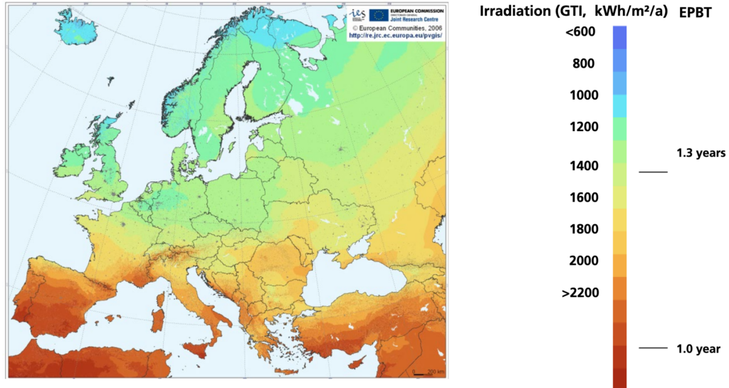 Actuellement, on observe que les panneaux “remboursent” l’énergie nécessaire à leur fabrication au bout de 0,9 à 1,3 an de production suivant les technologies, le lieu d’implantation et de fabrication du panneau (Fraunhofer PV report 2024). Un même panneau solaire implanté en Norvège ou en Espagne ne produira pas la même quantité d’énergie sur une même période.